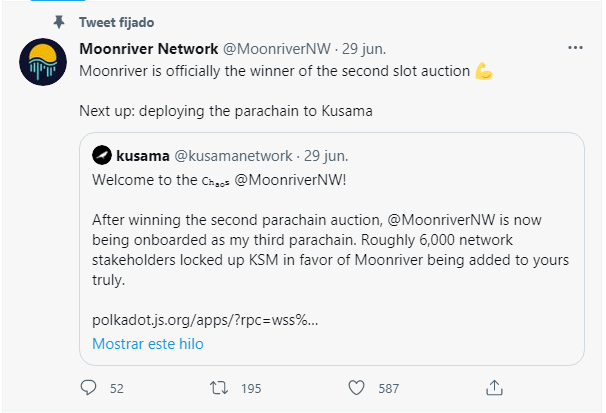 Moonriver Network became the second real parachain in Polkadot’s Canaria network, Kusama, by winning the second parachain auction.